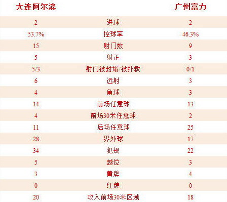 阿尔滨2-2富力技术统计