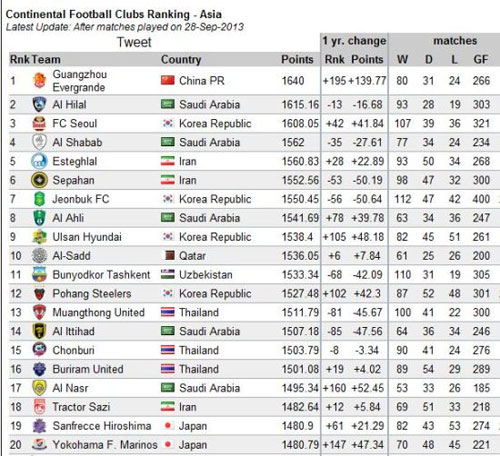 北京时间9月30日消息,在专业足球数据网站《Footballdatabase.com》近日发布的最新一期足球俱乐部排行榜中,广州恒大以1640分排在世界第46位,首次入围世界俱乐部排行TOP50;在亚洲俱乐部排行方面,广州恒大连续三期位居亚洲第一,并扩大了与第二名沙特豪门阿尔希拉尔的积分差距。广州恒大的亚冠半决赛对手日本柏太阳神滑落至亚洲第29位;山东鲁能和北京国安分列亚洲第44位和第45位,在中国俱乐部中分列第2位和第3位。