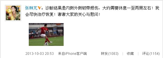 北京时间10月3日消息,在与日本柏太阳神比赛中受伤的恒大后防大将张琳芃通过个人微博发布消息称诊断结果是内侧外侧韧带损伤,大约需要休息一至两周左右。这样,这位现役中国国脚就将基本确定缺席本周日广州恒大客场与山东鲁能的天王山之战,但基本不会影响他参加广州恒大客战首尔FC的亚冠联赛决赛第一回合比赛。中国队将于10月15日客场与印尼进行亚洲杯预选赛的关键一战,张琳芃能否赶得上尚不确定,但将很可能错过国足的备战训练。