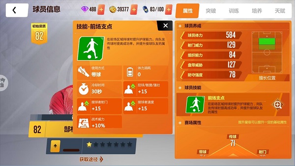 前场支点是个很强大的技能,发动后可以使接球队友的所有属性得到提升。此技能的发动条件为球员带球推进到进攻三区时自动触发,当某名球员接到由“支点”传过来的球后,其属性会得到提升,具体提升幅度如上图。