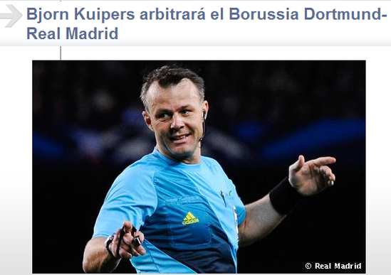 北京时间4月25日凌晨02:45,2012-13赛季欧冠半决赛首回合一场焦点战将在威斯特法伦球场打响,皇马客战多特蒙德。欧足联公布了执法本场比赛的裁判人选——荷兰主裁库伊珀斯。