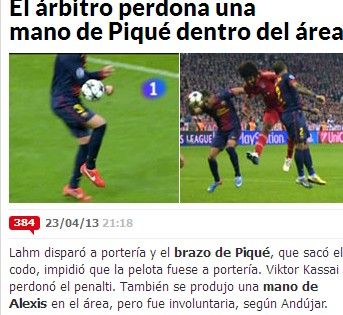第16分钟,拉姆前场抢断之后大禁区前沿右脚劲射,剃了光头的皮克在禁区内侧身封堵,不过皮球打在皮克的右手手臂上。拉姆提出投诉,但主裁考绍伊以及底线裁判均没有作出表示。从慢镜回放来看,皮克手球无疑,胳膊肘阻挡了射门,《阿斯报》和《马卡报》认为,拜仁应该得到1个点球。