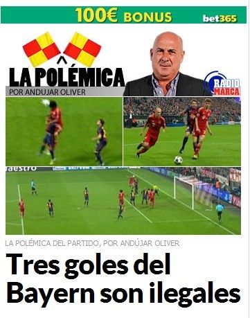 托马斯-穆勒为拜仁打进第1球,《马卡报》认为,这个进球不合法。罗本在右路传中,丹特高高跃起头球摆渡,穆勒完成空中接力将球顶入大门。这个进球过程中,丹特跳起时对身前的阿尔维斯有压人犯规动作,此时裁判就应该吹停比赛,示意丹特犯规。