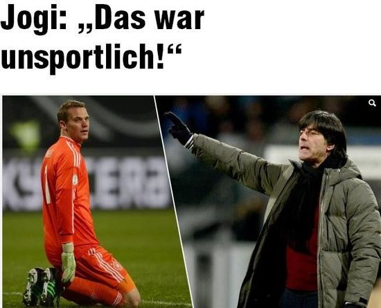 比赛一结束,诺伊尔就在混合区表示自己为失球负责。但德国队主帅勒夫仍然维护自己的弟子,他表示球迷们的嘘声是非常缺乏体育精神的行为,“失误都已经发生了,球员也知道自己的问题,球迷们有一些反应是很正常的。但我不能接受的是,球迷之后一直给他报以嘘声,要知道,诺伊尔是德国队的守门员,最近几年一直有出色的发挥。这次他不过犯了个小错误,就要遭遇全场球迷的嘘声。之后的比赛里球迷们不断在嘲讽他,这非常没有体育精神。”勒夫愤怒的说道。