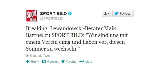 几乎在同时,德甲专家Raphael Honigstein发布推特称,在格策加盟拜仁的消息被曝光后,多特蒙德方面立刻向莱万多夫斯基提供了一份新的续约合同,但是遭到莱万方面的拒绝。Honigstein认为莱万已经同意加盟拜仁,但是拜仁与多特间的转会费的细节尚未谈妥,据称拜仁方面愿意付出2500万欧元的转会费。