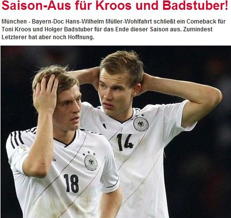 和上个赛季相比,本赛季的拜仁阵容齐整,球队顺利挺进欧冠决赛不仅没有人因为累积黄牌而停赛,队内的伤病影响也不算严重。除了几名青年球员外,拜仁阵中只有巴德施图贝尔和克罗斯还受伤病的影响。近日拜仁队内传出坏消息,队医沃尔法特博士表示,克罗斯和巴德施图贝尔二人的伤势在本赛季内都难以恢复,也就是说二人的赛季已经提前结束了。对于残酷的命运,巴德施图贝尔表示,自己仍然抱有赛季内复出的希望。
