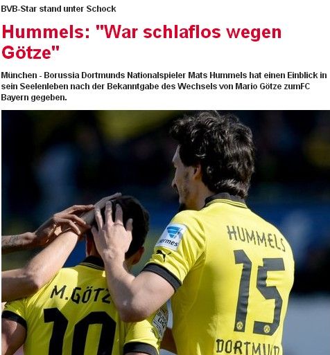 在接受天空电视台采访时,胡梅尔斯沮丧的表示:“格策在我看来至少是目前世界上最好的10名球员之一,所以他的转会对我们来说是一个巨大的冲击,我几乎一晚上都没睡好。”