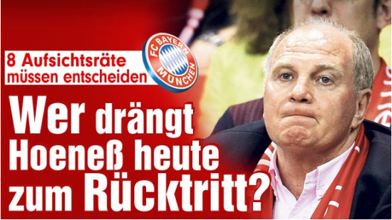 卡恩希望赫内斯能够避避风头,但拜仁主席在现在这个节骨眼可做不到。就在今天,拜仁监事会将对赫内斯的问题给出最后的处理意见,德国《图片报》就打出了“赫内斯今天离职?”的大标题。从目前的情况来看,赫内斯最有可能在今天暂时离任,然后由副主席霍普夫纳暂时顶替他的位置,在解决了税务问题后他可以回到监事会继续担任主席。至于媒体之前猜测的诸如直接下台、重选主席、监事会保持沉默等,媒体认为,这些都不太可能发生。