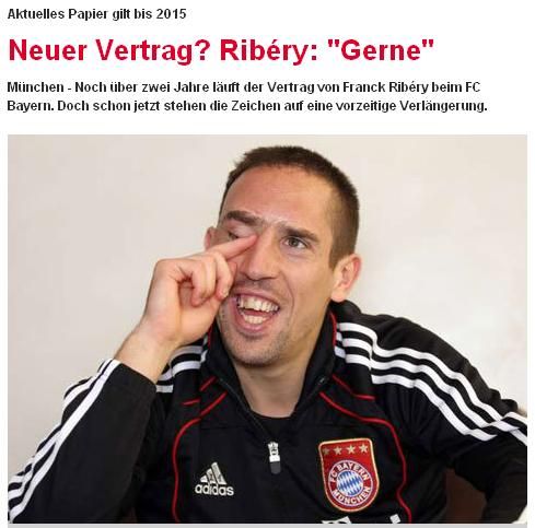 本赛季表现出色的拜仁有望夺得三冠王,而且他们又引进了格策这样的球星,下赛季的拜仁实力将更加强大。不过在引援的同时,拜仁也准备留住队内的核心球员,比如里贝里。据德国媒体透露,拜仁和里贝里双方都有意延长合同。