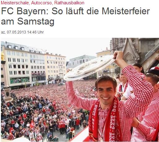 终于,在已经确定夺冠几乎一个月的时间后,拜仁球员可以摸到真正的德甲冠军奖盘了。在本周末主场和升班马奥格斯堡的比赛后,拜仁将会进行盛大的德甲夺冠庆典,庆祝球队队史上的第22个德甲冠军,第23个德国顶级联赛冠军。在和奥格斯堡的比赛后,拜仁主帅海因克斯将会第一次在公众面前展示本赛季的德甲冠军奖盘。之后球队将会前往玛利亚广场,开始盛大的狂欢活动。这次活动将从晚上7点一直持续到晚上9点30分,众多的拜仁名宿也将亲临活动现场。