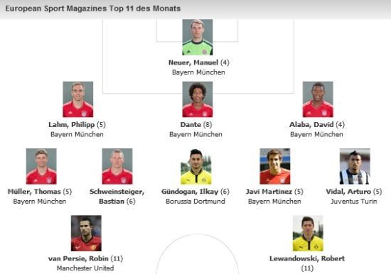 本赛季表现异常的拜仁成为最大的赢家,共有7名球员入选最佳阵容,分别是诺伊尔、拉姆、丹特、阿拉巴、穆勒、施魏因施泰格以及哈维-马丁内斯。淘汰皇马晋级欧冠决赛的多特有两人入选,分别是莱万多夫斯基和京多安。