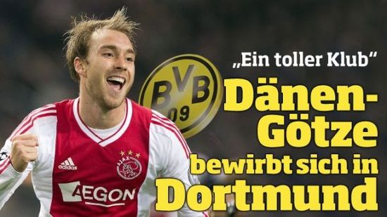 格策即将离队,多特蒙德的前场组合缺少了一名天才球员。但德国媒体爆料称,多特蒙德已经找到了格策的替身,他就是21岁的阿贾克斯中场新星埃里克森。过去几周的时间里,多特蒙德一直和埃里克森传着绯闻,刚刚随阿贾克斯成功夺得荷兰联赛冠军的丹麦新星,被传出是格策的第一接班人。但多特蒙德要想引进埃里克森顶替格策也绝非易事,据媒体的消息称,欧冠半决赛被多特蒙德淘汰的皇马、以及英超豪门曼联,也有意埃里克森。