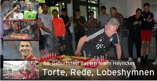 5月9日,是拜仁主帅海因克斯68岁的生日,拜仁全队也为海帅准备了一个简单的生日庆典。在结束了周四的训练课后,拜仁全体球员、俱乐部CEO鲁梅尼格、体育主管萨默尔一起围着蛋糕出现,庆祝海因克斯的68岁生日。这让海因克斯倍感惊讶,在吹蜡烛之前海帅发表了一个简短的演讲,感谢拜仁全队上下的关心,并表示希望球队在最后的两场决赛里都可以取得最终的胜利。演讲结束后海帅吹灭了蜡烛,68支蜡烛他只吹了2次就全熄灭了。