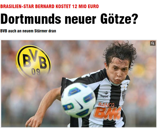 据《图片报》报道,多特蒙德经理佐尔克已亲赴巴西挑选格策接班人,他在上周同米涅罗竞技队主席共进晚餐,商谈巴西中场伯纳德的转会事宜,这名20岁的中场小妖身价为1200万欧元。