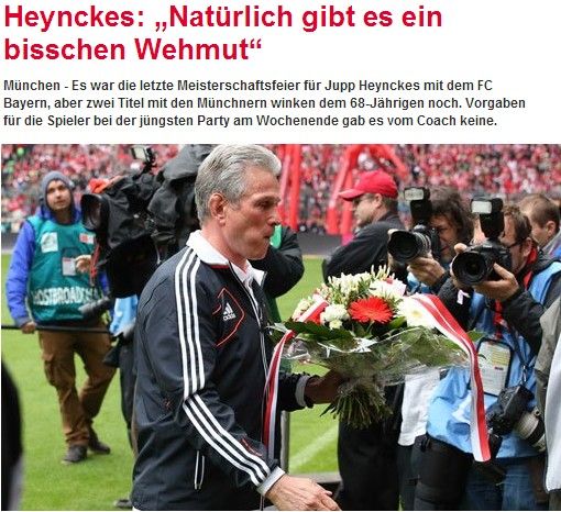 周末,拜仁迎来了刻有球队名字的德甲冠军奖盘,并举办了盛大的夺冠庆典,疯狂的庆祝让球迷们都感到意犹未尽。但更让人感到遗憾的,毫无疑问是即将离开球队的功勋主帅海因克斯了。本赛季在这位已经68岁的老帅的带领下,拜仁踢出了华丽的足球,取得了非凡的成绩。但本赛季结束后,海帅就将离开拜仁、离开德甲联赛。在接受采访的时候海帅表示,要离开这样一支优秀的球队,自己感到非常的悲伤。但海帅表示现在还不是感动的时候,拜仁要为三冠王发起冲击。
