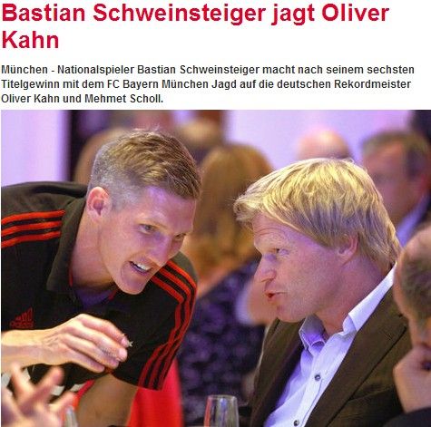 在上周末的夺冠庆典,当拜仁队副施魏因斯泰格从球员通道出来的时候,他和在场边列队欢迎德甲冠军队伍的拜仁前辈卡恩深情拥抱。事实上,二人曾经做过好几个赛季的队友,而在不知不觉之间,施魏因斯泰格也逐渐和当年的拜仁老大哥一样,成为了新的传奇。在夺得了本赛季的德甲冠军之后,施魏因斯泰格已经夺得了6次的德甲冠军,是德甲现役球员中夺冠次数最多的,距离卡恩和绍尔8次夺冠的历史纪录也只差2次而已。
