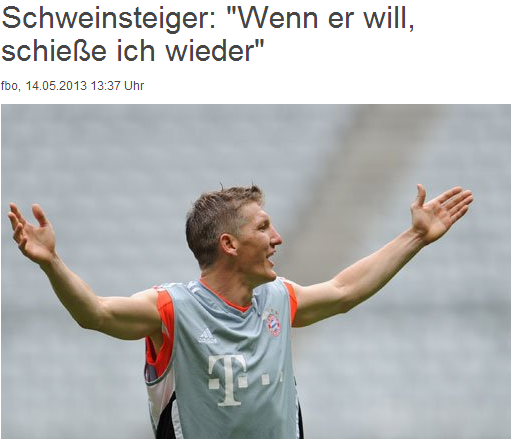 上赛季的欧冠决赛里,施魏因斯泰格因为不敢看罗本主罚的点球,还有最后射失点球的表现,使得自己成为了拜仁球迷心目中的“罪人”。但本赛季施魏因斯泰格再接再励,带领拜仁卷土重来。本赛季的拜仁队副表现要比上赛季出色不少,无论是进球、助攻、还是场上的调度,都已经到达了职业生涯的巅峰。近日在接受采访的时候施魏因斯泰格表示,虽然上赛季的欧冠决赛射失了点球,但2周后的决赛如果球队需要的话,自己一定会勇敢的再次走上点球点。
