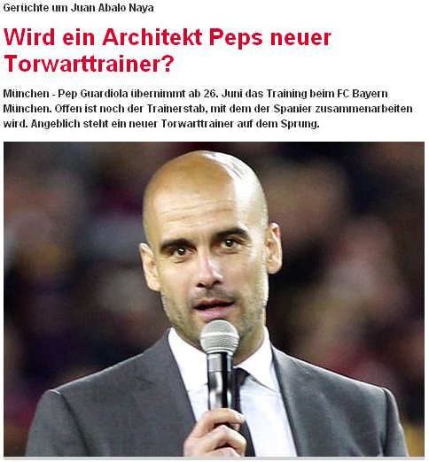 今年1月拜仁官方宣布瓜迪奥拉将在夏天取代海因克斯,成为球队的新主帅。而瓜迪奥拉也一直在努力构建自己的教练班子,而本周西班牙《世界体育报》和德国《慕尼黑日报》均报道称,瓜迪奥拉看上了一位在西班牙丙级球队任职的门将教练,并有意邀请他追随自己来拜仁工作。