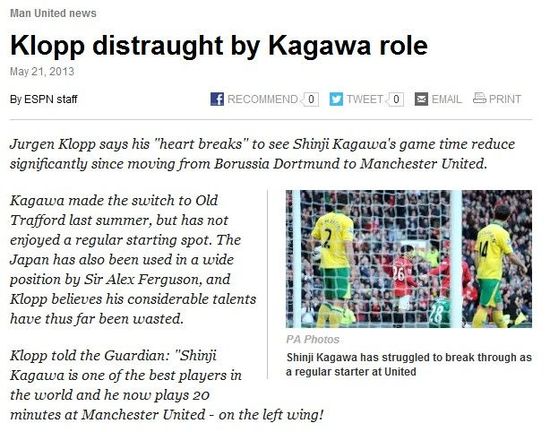 多特蒙德主帅克洛普惋惜日本中场香川真司在曼联不受重用,还要踢不习惯的位置,香川和沙欣一样,都在成名后转会超级豪门,结果却不理想;率多特蒙德晋级欧冠决赛后,克洛普再次强调他不会离队。