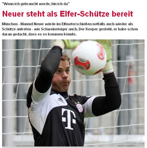 上赛季拜仁在欧冠决赛中点球输给了切尔西,不过门将诺伊尔表示,自己这次为点球大战做好了准备。“如果我说自己没有想过如何应对点球,那么我就是在说谎,当然我希望拜仁能在点球大战前就赢得胜利。”同时诺伊尔还表示自己愿意亲自踢点球,“如果需要我,我就在那里。”而施魏因斯泰格也表示,“如果决赛进入点球大战,教练安排我主罚的话,那么我就会去踢。”