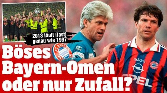 1997年的欧冠决赛,多特蒙德力克强敌尤文图斯夺冠,夺得了队史上唯一的一座欧冠奖杯。现在多特蒙德时隔16年再次有夺得欧冠的机会,黄黑军团能否战胜强大的拜仁复制当年的奇迹呢?德国媒体总结后发现,非常有可能!在2013年的足球界,发生了许多的事情都和1997年的那个赛季一模一样,德国媒体《图片报》特意撰文一篇,总结出了2013年和1997年的12大巧合,得出的结论是:多特蒙德就要夺冠了!“难道多特蒙德还有可能输球吗?”图片报写到。