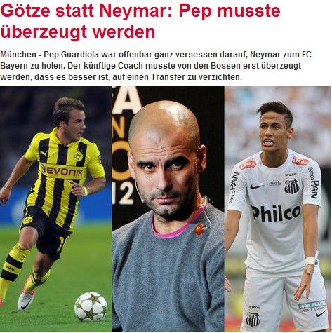今年随着拜仁宣布瓜迪奥拉将在下赛季上任,不少球星都和拜仁传出了转会绯闻。一度有传闻说,巴西新星内马尔和拜仁走的很近,将会加盟拜仁。但最终内马尔还是加盟了巴萨,并没有来到拜仁。近日拜仁主席赫内斯透露,原本拜仁新帅瓜迪奥拉表态称希望内马尔加盟球队,但拜仁高层用曾经买南美球员失败的例子说服了他。最终拜仁转攻德国本土球员,以3700万欧元的价格买断了多特蒙德超新星格策的合约。比起身价5400万欧元,还不一定适应欧洲联赛的内马尔,拜仁这次显然做出了正确的决定。