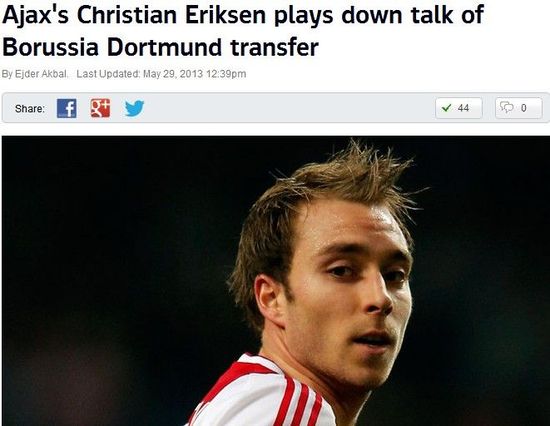 最近一段时间,多特蒙德一直和阿贾克斯的丹麦新星埃里克森传出转会绯闻,一直有消息称多特蒙德有意引进埃里克森来顶替格策的位置。而多特蒙德主帅克洛普也承认了对埃里克森的兴趣,丹麦媒体也爆料称多特蒙德已经和阿贾克斯达成协议,似乎丹麦新星加盟黄黑军团只是时间的问题。但近日埃里克森亲口表示,自己加盟多特蒙德一事还没有任何的进展,并表示多特蒙德不是自己“唯一的选择”。而阿贾克斯的体育主管奥维马斯也确认,球队并没有收到来自多特蒙德的报价。