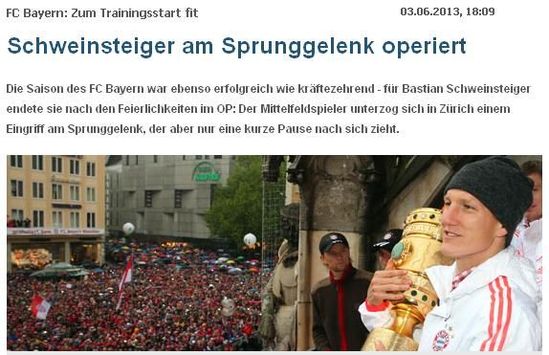 在刚刚结束的2012-13赛季中,拜仁可以说是欧洲最成功的俱乐部,他们夺得了欧冠、德甲、德国杯冠军,成为了德甲历史上首个三冠王。而在全队带着三冠的喜悦开始度假时,施魏因斯泰格却不得不接受手术。当地时间6月3日,拜仁俱乐部的媒体传播总监马库斯-豪尔维克正式宣布,施魏因斯泰格已经到瑞士苏黎世接受了脚踝手术。