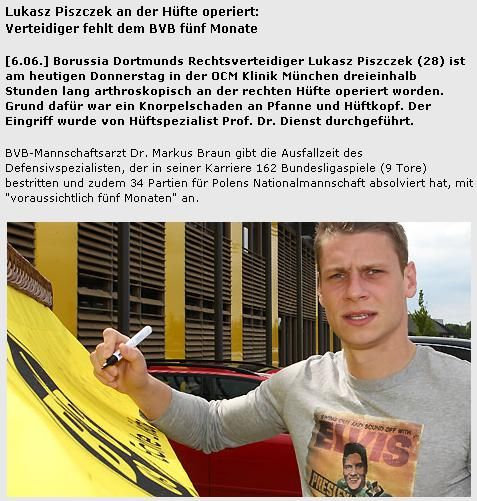 28岁的皮什切克是多特蒙德队内的绝对主力,不过他的髋关节一直受到伤病的困扰,早在2008年效力于柏林赫塔期间皮什切克就曾接受髋关节手术,当时还休养了半年时间。而本赛季皮什切克的髋关节又受伤了,但他为了球队一直咬牙坚持,直到踢完欧冠决赛后才考虑接受这次手术治疗,希望能彻底根治自己的髋关节老伤。