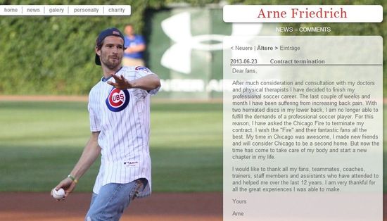 北京时间6月23日晚,现年34岁的前德国国脚弗雷德里希宣布因伤退役,他曾长期占据德国国家队主力位置,并在2006年和2010年两次随队获得世界杯季军。在和医生以及理疗专家沟通后,我经过了深思熟虑,决定结束自己的足球生涯。过去几周和几个月的时间,我受苦于背部疼痛加剧。我的下背腰椎间盘突出,我已经不能达到职业球员的要求了。因此,我要求芝加哥火焰队与我解约。我预祝火焰队和球迷好运。我在芝加哥的日子非常了不起,我交到了新朋友,并把这里当作我的第二故乡。不过现在时间到了,我必须照顾好自己的身体,开始新的生活。