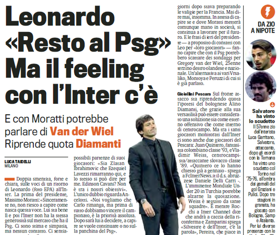 "莱奥在巴黎干得很棒,我们也没有巴黎那么多金钱供他支配。相比莱昂纳多,我们对巴黎圣日耳曼的球员更感兴趣。"在接受媒体采访中,国际米兰主席莫拉蒂针对巴西人回归梅阿查的传闻作出这样的表态。而与此同时,莱昂纳多也对自己的未来做出澄清,"我会继续留在巴黎圣日耳曼,根本没有考虑回归意大利的可能。"意大利媒体称这种表态不可信,因为2011年6月莱昂纳多还表态说不会离开国米,但数天之后他就收拾行装去了巴黎。