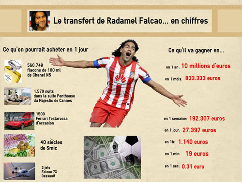 而据法国媒体透露,法尔考的税后年薪高达1400万欧元,能够在目前的世界足坛高薪榜上排进前三,仅次于埃托奥的2000万欧元以及梅西的1600万欧元,与伊布并列世界第三,当然,有消息称C罗将以平梅西年薪的待遇与皇马续约,即便如此,法尔考还是稳居世界前五。这对于年仅27岁、登陆欧洲足坛仅仅4年的哥伦比亚前锋来说,实在是了不起的成就。