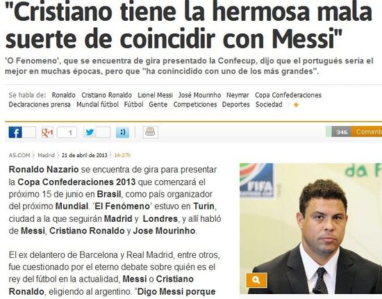 “梅西独一无二,没人能踢得像梅西那样。梅西和C罗都强于其他球员,但C罗达不到梅西的境界。在技术和天赋上,也许他们有相似之处。他们都能踢出伟大的足球,但梅西是这个星球上最出色的球员,就是这么简单。”不久之前,贝克汉姆曾这样盛赞梅西。如今,另一名皇马传奇罗纳尔多也做出了类似的表态。在接受《阿斯报》采访时,外星人明确指出,遇上世界上最强的梅西,C罗实在太不幸了。