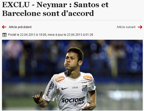 内马尔的转会身价,将会达到4000万欧元,巴萨已经向桑托斯支付了1000万欧元的定金。桑托斯原本希望把内马尔留到2014年巴西世界杯后,但双方最终决定,内马尔的转会日期将会提前到今年夏天。据《le10sport》杂志透露,内马尔将在今夏踢完联合会杯之后,正式加盟巴萨。