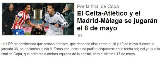 将国王杯的决赛安排在星期五的晚上,这是西班牙足协和主转播方最终达成的协议,唯有如此才能实现各方利益的最大化,而将第36轮提前踢,也是考虑到了诸多因素,一来当时皇家马德里已经结束了欧冠半决赛,连续三周双赛银河战舰而言并没问题,二来如果皇家马德里进入欧冠决赛,那么提前踢联赛对穆里尼奥备战温布利的决战更加有利。
