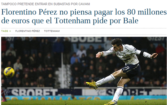“热刺希望把贝尔卖出新的世界第一身价”,不久前《太阳报》曾这样说道,热刺给贝尔的标价高达一亿英镑(1.17亿欧元)。不过据《机密报》透露,皇马显然不会满足热刺的要求。事实上,弗洛伦蒂诺连8000万欧元都不打算出。