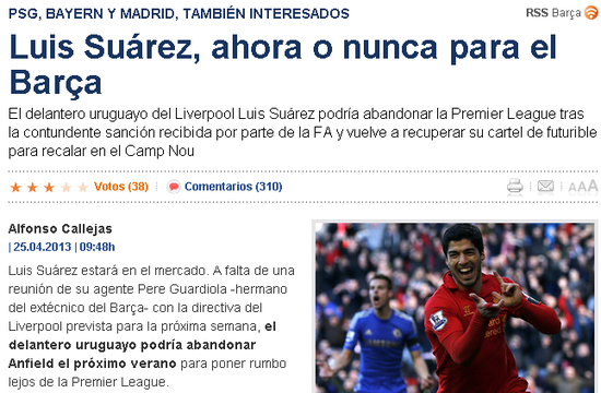 《每日体育报》:巴萨追求路易斯-苏亚雷斯