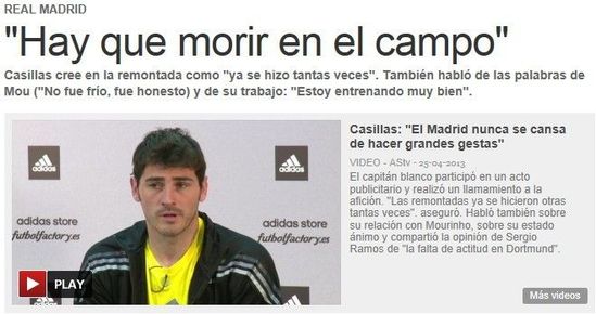 皇马在昨天进行的欧冠半决赛首回合客场1-4惨败于多特蒙德,队长卡西利亚斯没能登场,他在目睹皇马被屠后出席了阿迪达斯公司的一个宣传活动,期间他接受了采访。卡西利亚斯表示,他对皇马次回合完成逆转抱有信心,同时还有坦言,他跟穆里尼奥并无深仇大恨。