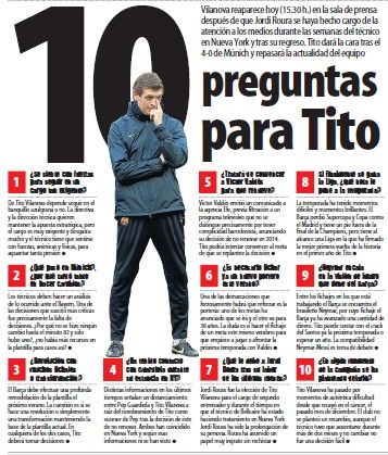 巴塞罗那当地时间周五傍晚,比拉诺瓦将在时隔数月后重新回到赛前新闻发布会的现场,在经历了一场安联的惨败之后,此前一直避开新闻发布会的比拉诺瓦必须出面稳定信心,而《世界体育报》则是精心的准备了十大问题,不知届时比拉诺瓦会如何应对?