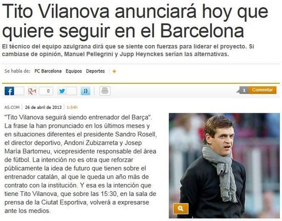 西班牙当地时间今天下午15点30分左右,巴萨主帅比拉诺瓦将会出席新闻发布会,届时他会就自己是否愿意继续执教巴萨表明态度。如果比拉诺瓦准备本赛季结束后卸任,那么巴萨新帅便极有可能会从海因克斯与佩莱格里尼当中产生,这一消息现已被《阿斯报》曝光。