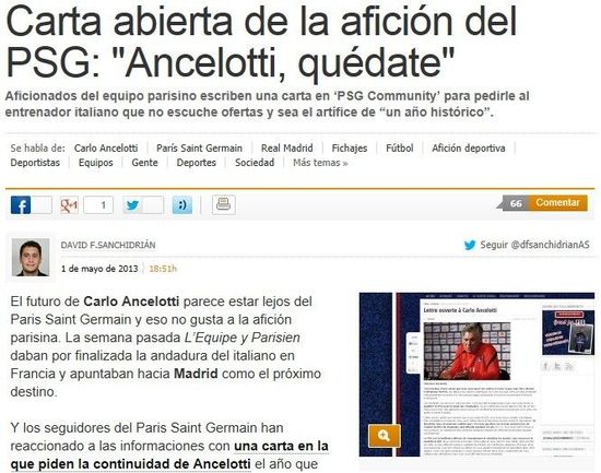 《阿斯报》:巴黎球迷发公开信挽留安帅