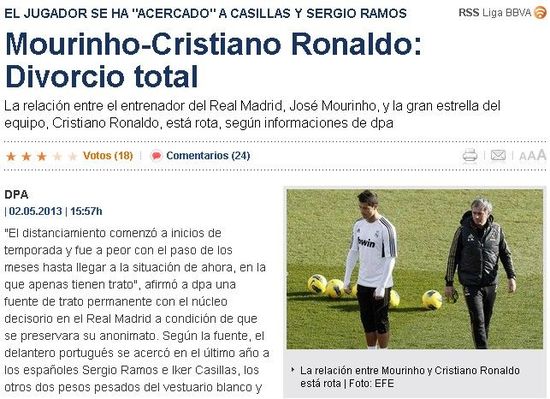 一名不愿透露姓名的皇马球员,向德新社记者泄露了更衣室秘闻。在本赛季初,穆里尼奥和C罗之间就产生了裂缝。而随着赛季深入,穆里尼奥和C罗之间的关系已经彻底破裂,如今C罗完全站在以拉莫斯、卡西为首的西班牙帮的立场上。拉莫斯和卡西是坚定的“反穆分子”,C罗与西班牙帮亲近,自然无法保持与狂人的交情。