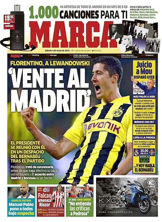 在这个夏天,伊瓜因将会离开皇马,白衣军团将会收购一名新中锋。媒体此前一直念叨着阿奎罗、卡瓦尼、法尔考等人的名字,但现在,弗洛伦蒂诺却看上了莱万多夫斯基。据《马卡报》在头版头条报道称,弗洛伦蒂诺亲自向莱万发出了邀请。