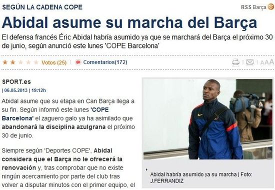 据《每日体育报》最新消息,现年34岁的法国后卫阿比达尔极有可能会在今年夏天离开巴萨,球员本人已经抱定这个想法。与此同时《每日体育报》还在头版头条上宣称,巴萨准备花2500万欧元求购多特蒙德的土耳其裔中场大将京多安。