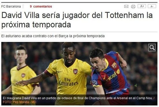 热刺求购比利亚一事是由该队主帅博阿斯亲手操办,前不久博阿斯来了一趟加泰罗尼亚首府,他此行的目的是跟巴萨高层商讨比利亚今夏转会事宜,此外还与比利亚本人有过交谈。《世界体育报》称,比利亚原则上同意下赛季转投热刺,这桩转会只需热刺给出让巴萨满意的报价后即可以完成。