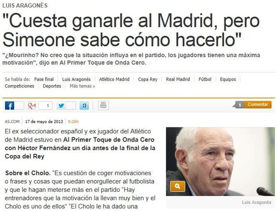 曾执教过皇马、巴萨、马竞的安蒂奇也于日前接受了采访,现任山东鲁能主帅的他在谈及周末这场国王杯决赛时表示:“马竞千万不要肾上腺素激增,如果这样的话,他们就将付出沉重的代价。他们应该做到自争超越自我,但话说回来,在伯纳乌跟皇马交手注定是很困难的。马竞已经拿到了下赛季欧冠门票,而周末这场比赛是一次男人间的对决,关乎荣耀。”