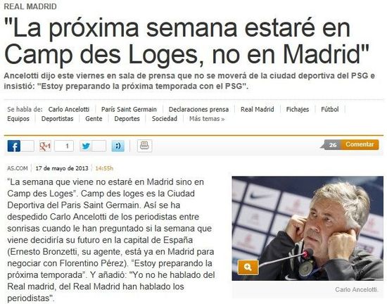 随后有记者向安切洛蒂问及他是否会在今夏前往皇马执教的问题,安切洛蒂是这样回答的:“下周我仍将出现在巴黎圣日耳曼的训练基地,而不是身处马德里。我将开始为巴黎圣日耳曼下赛季去做一些准备,我从未跟皇马谈过,只有你们这些记者总是在说,我与皇马正在谈判。”