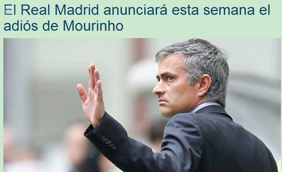 在丢掉国王杯冠军之后,穆里尼奥的皇马生涯还剩下最后两场联赛。对于已经锁定亚军位置的皇马而言,这两场比赛没什么真正意义。在《阿斯报》的网络调查中,81%的球迷希望高层立刻解雇穆里尼奥,并让B队主帅托里尔暂时救火指挥最后两轮联赛。
