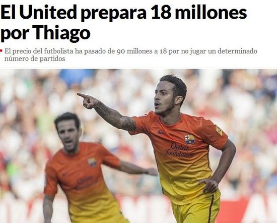 就在蒂亚戈表露出想要离开巴萨的念头不久,英超霸主曼联就再次表态想要引进这位巴萨中场新星的念头。《马卡报》爆料称,曼联正在考虑下赛季将蒂亚戈带到老特拉福德,而且无需与巴萨进行谈判,只需备好1800万欧元即可,因为这是目前买断蒂亚戈所需支付的价格。在两年前与巴萨续约时,蒂亚戈的违约金高达9000万欧,但如果他没有踢够一定数量的比赛时,违约金就会下降,目前则是1800欧。