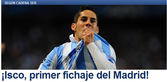 “伊斯科成为皇马下赛季首名新援!”权威的塞尔电台今天公布了这一消息。据塞尔电台透露,伊斯科、皇马和马拉加已经就欧洲金童的转会达成了一致,目前只差正式签署合同而已。不出意外的话,弗洛伦蒂诺将在本赛季西甲联赛结束后,正式宣布伊斯科的加盟。